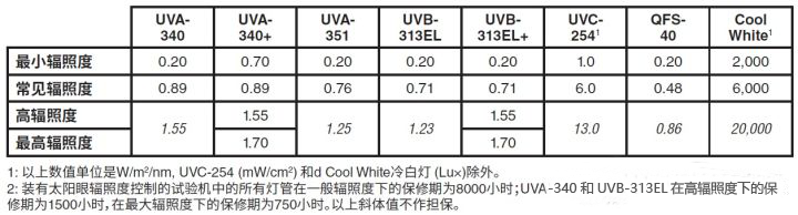有太陽眼輻照度控制系統(tǒng)的設(shè)備可以設(shè)定輻照度水平。例如, 對于 UVA-340燈管, 設(shè)定0.89W/m2@340nm的輻照度和夏天正午時光強相當(dāng)。為了更快地得到測試結(jié)果,紫外老化箱QUV可被設(shè)置在夏天正午光強200%條件下運行?;诓煌瑹艄茴愋拖卤砹谐鲎罡咻椪斩人郊耙恍┏S玫妮椪斩仍O(shè)置點。